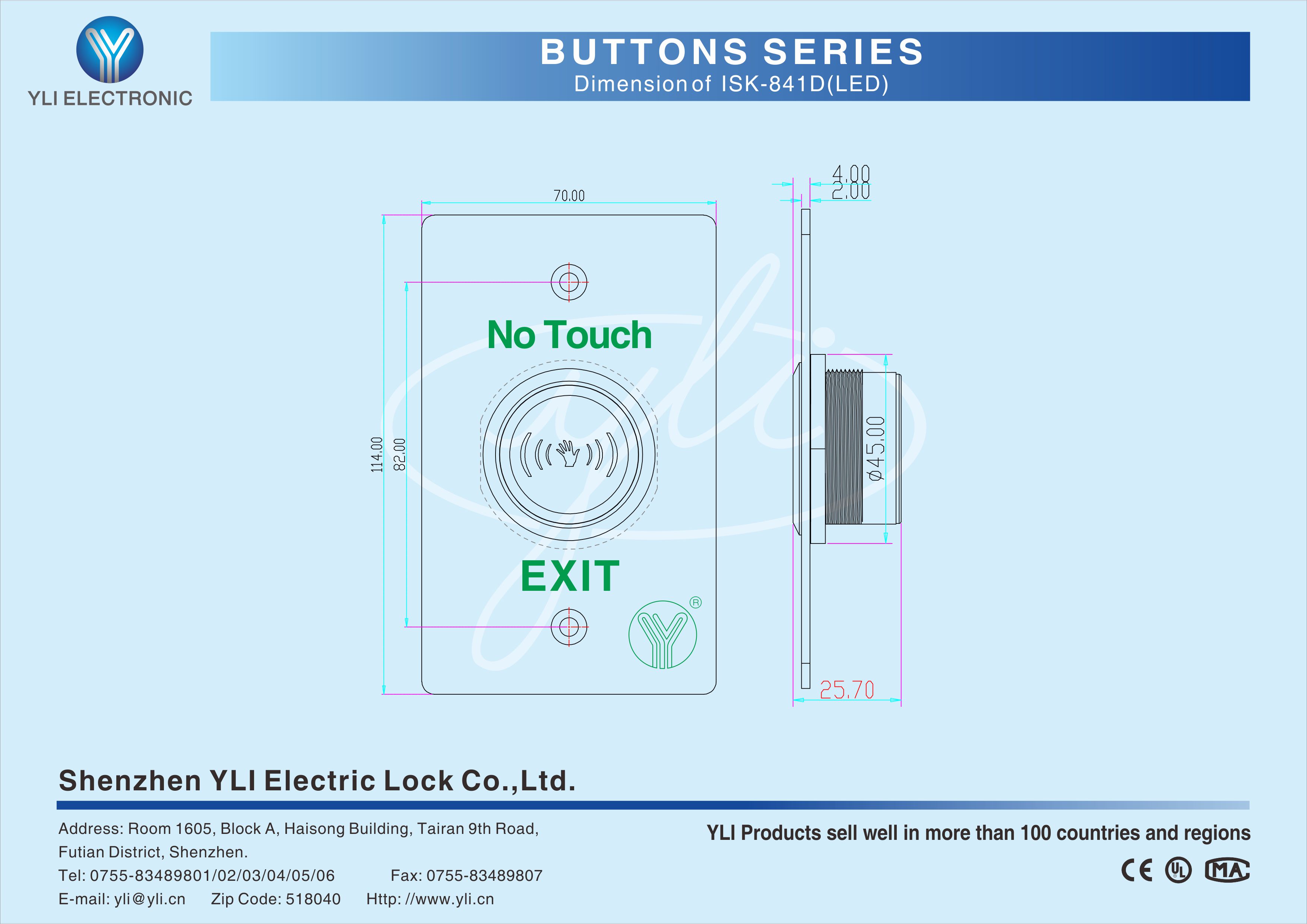 ISK-841D is an Infrared Sensor Exit Button with stainless steel in size of 114Lx70Wx25.7H(mm) , American Standard,suitable for all kinds of locks. 4-12cm induction distance is adjustable, 1~25S Time delay is adjustable. Red??LED indicator: Power ON(standby);Green LED indicator: Power ON(sensation).