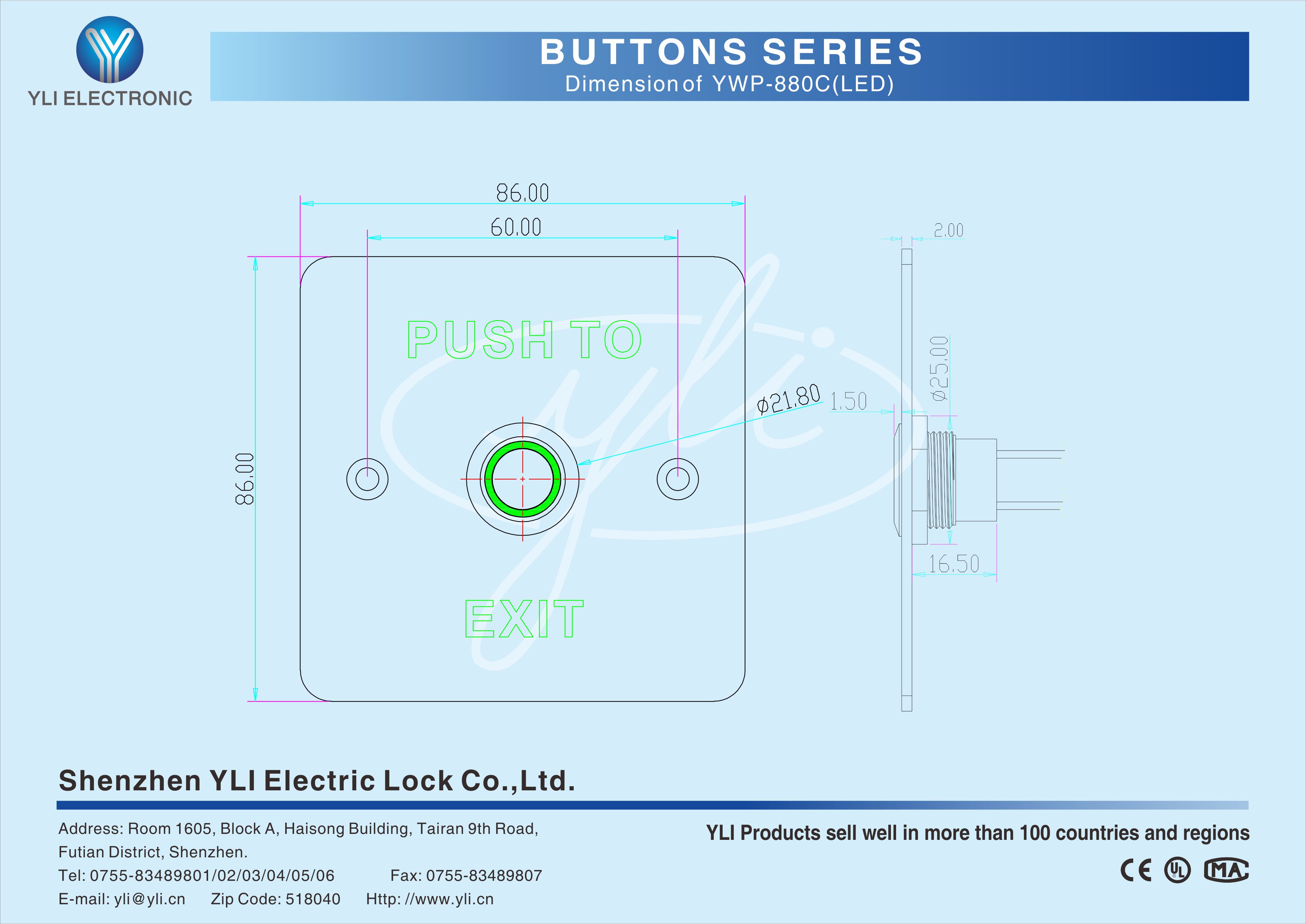 YWP-880C(LED) is a stainless steel door release button with LED in size of 86Lx86Wx20H(mm), IP-67 waterproof design, dustproof, American standard,which is the most common and the most frequently used in the access control systems.