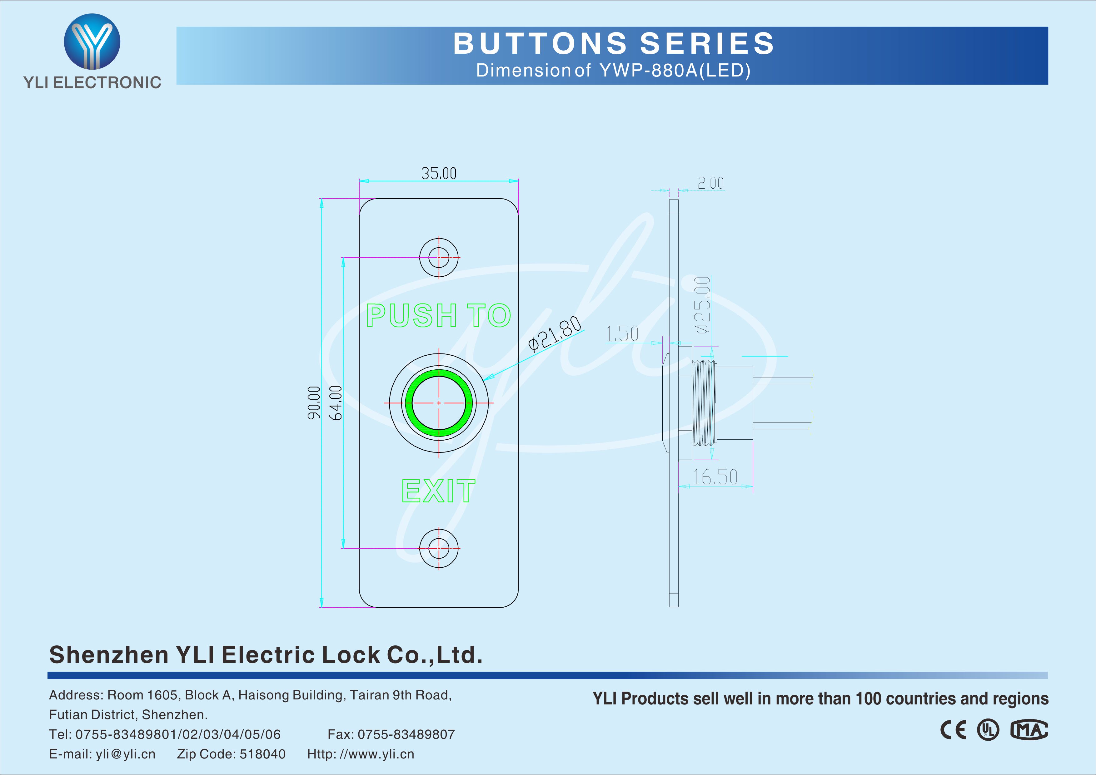 YWP-880A(LED)-PW is a stainless steel door release button with LED in size of 90Lx35Wx20H(mm),IP-67 waterproof design, dustproof, American standard,which is the most common and the most frequently used in the access control systems.