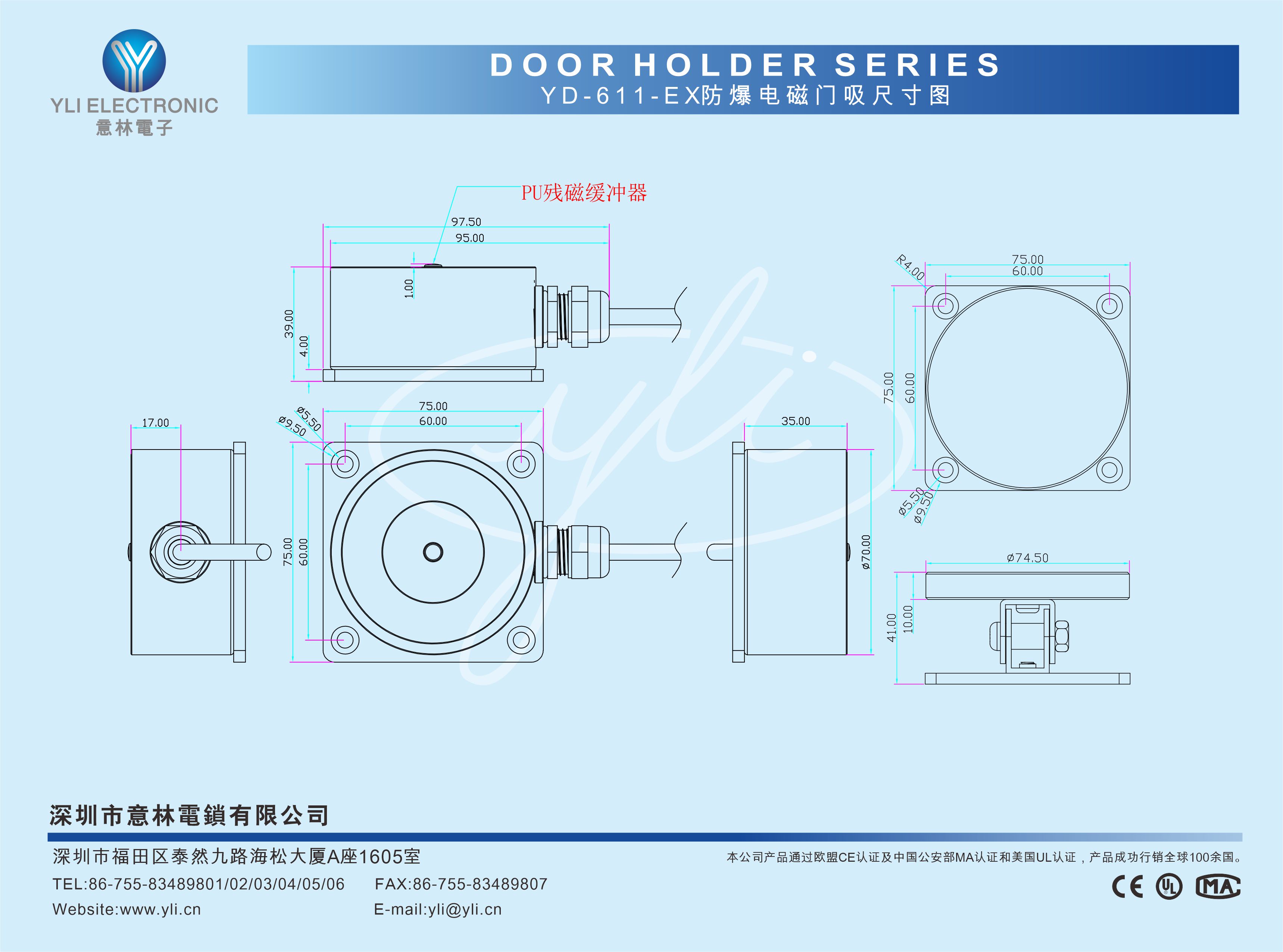 Yli explosion-proof electric door holder is widely used in petrochemical industry and dangerous environments such as chemical, oil depots, ships, drilling, platforms, gas stations, ports,aerospace, military industry, medicine, steel, fireworks factories, mechanical grain processing and storage, etc.