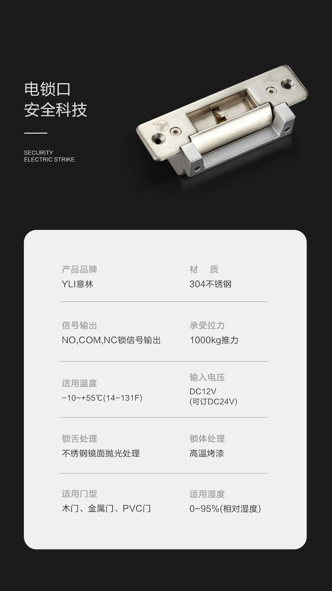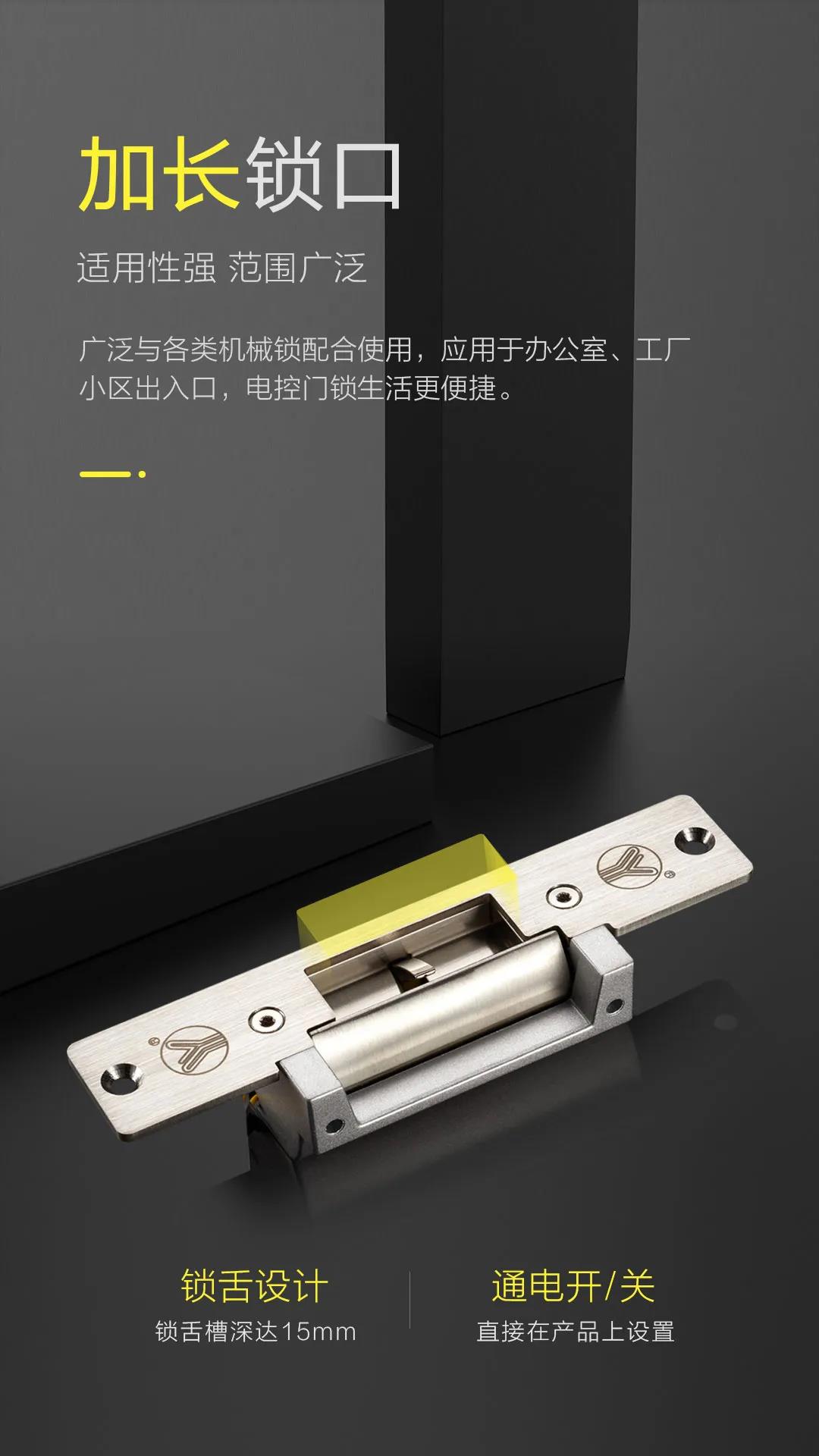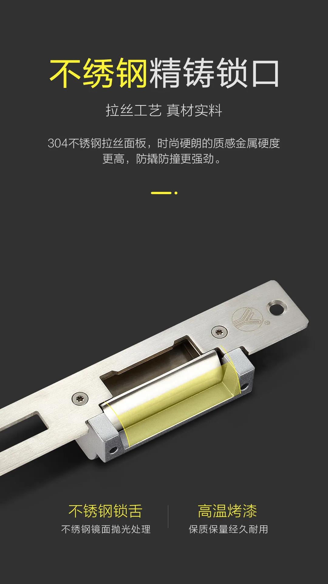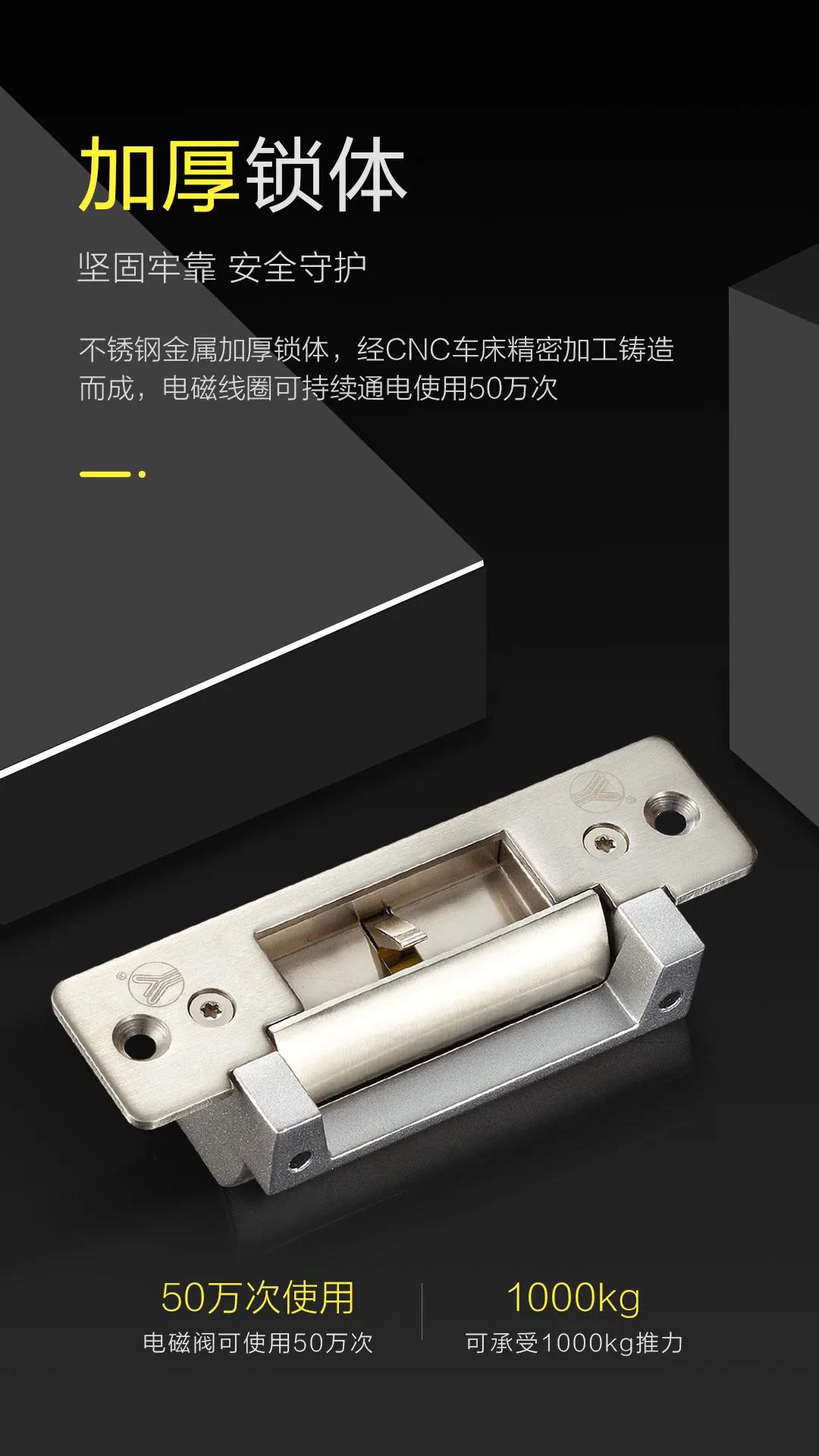 本公司產品配套齊全,內有一組門鎖狀態信號輸出干接點(NO/NC/COM),作為遠端監控門鎖是否上鎖狀態。電鎖口用電磁產生的推動或拉動釋放桿產生的工作原理上鎖或開鎖,總稱電鎖通常都是用電磁產生的電磁力工作。電鎖口兩種工作方式:分別是斷電上鎖型,即在沒通電的情況下,鎖舌打不開,反之通電開鎖;斷電開鎖型,即在通電的情況下,鎖舌可以打開,反之通電上鎖。