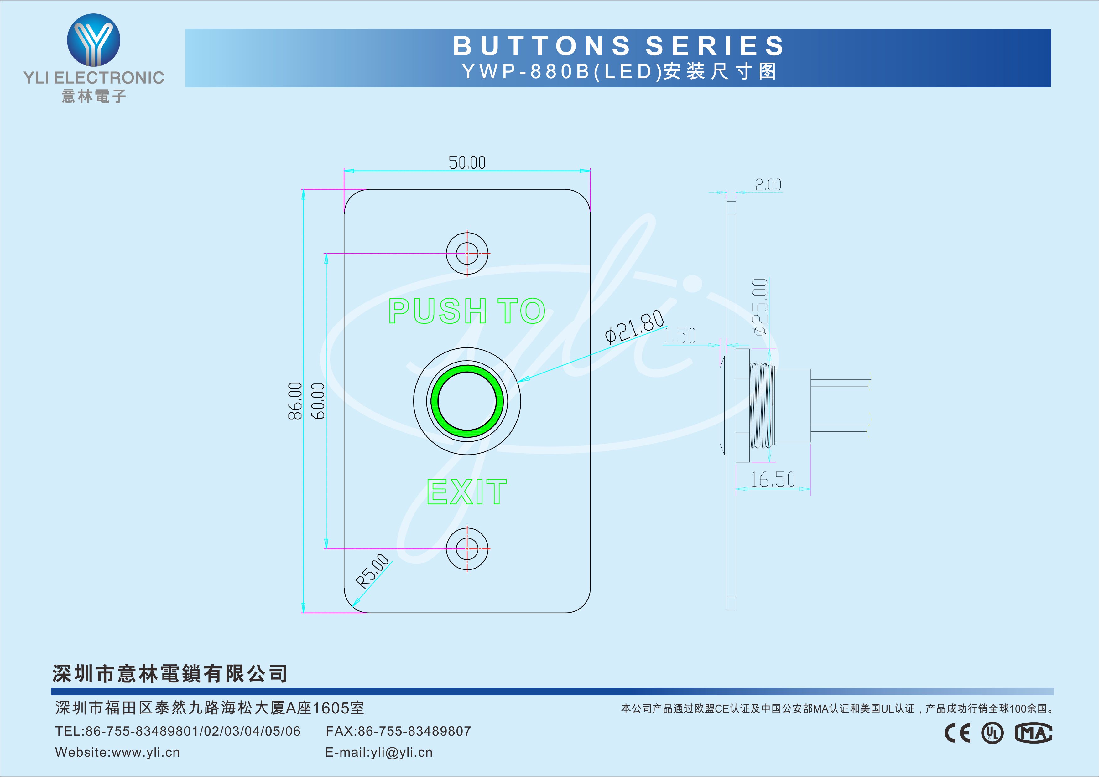 YWP-880B(LED)是一款防水型按壓式門禁專用開關(guān),防雨水設(shè)計,LED燈顯示:通電亮燈,常亮綠色。面板304不銹鋼拉絲工藝處理,金屬材質(zhì)按鈕,經(jīng)CNC車床加工后拋光而成,100萬次耐用測試合格,堅固耐用,產(chǎn)品美觀。門禁系統(tǒng)配套的最佳選擇。