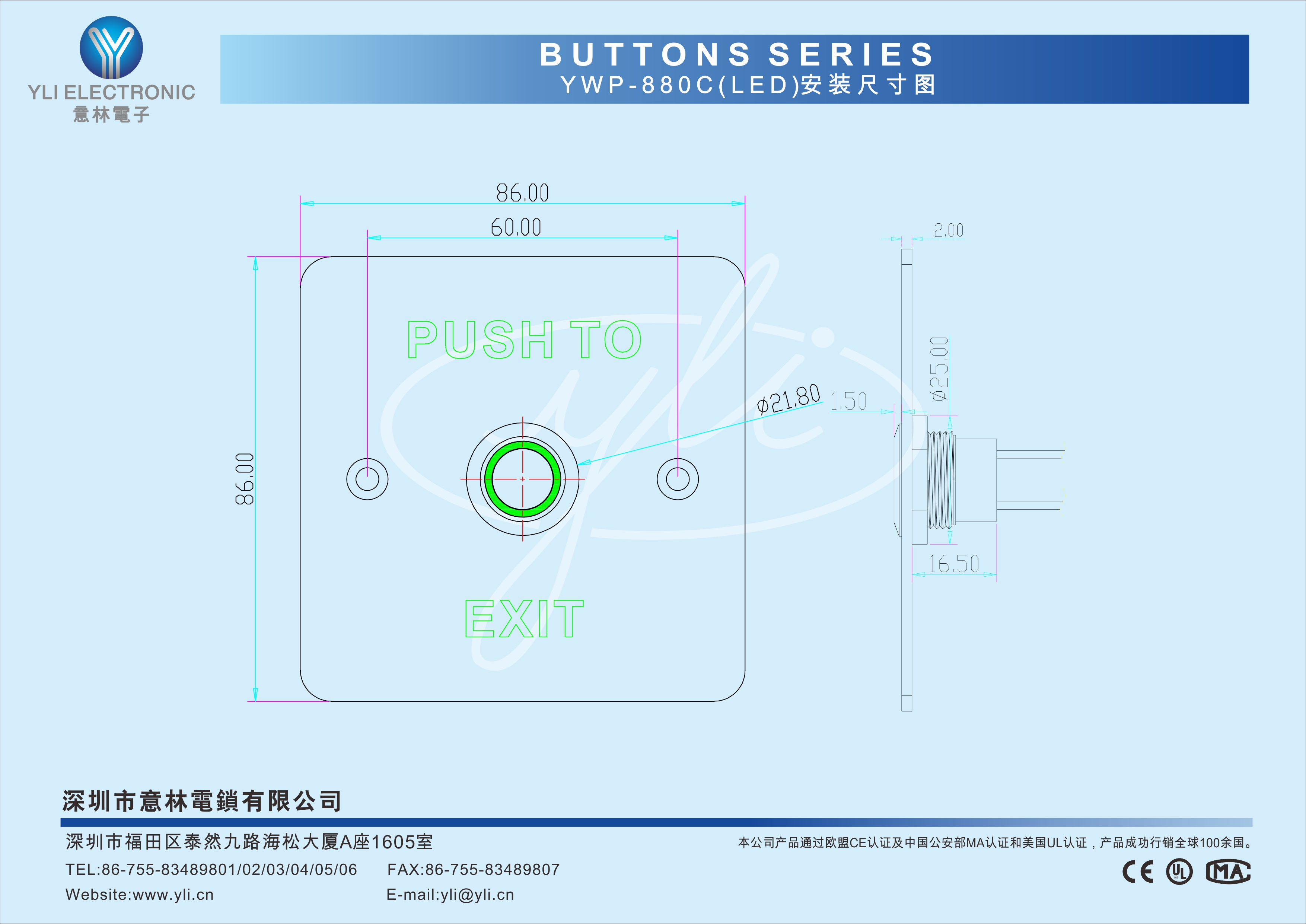 YWP-880C(LED)是一款防水型按壓式門禁專用開(kāi)關(guān),防雨水設(shè)計(jì),LED燈顯示:通電亮燈,常亮綠色。面板304不銹鋼拉絲工藝處理,金屬材質(zhì)按鈕,經(jīng)CNC車床加工后拋光而成,100萬(wàn)次耐用測(cè)試合格,堅(jiān)固耐用,產(chǎn)品美觀。門禁系統(tǒng)配套的最佳選擇。