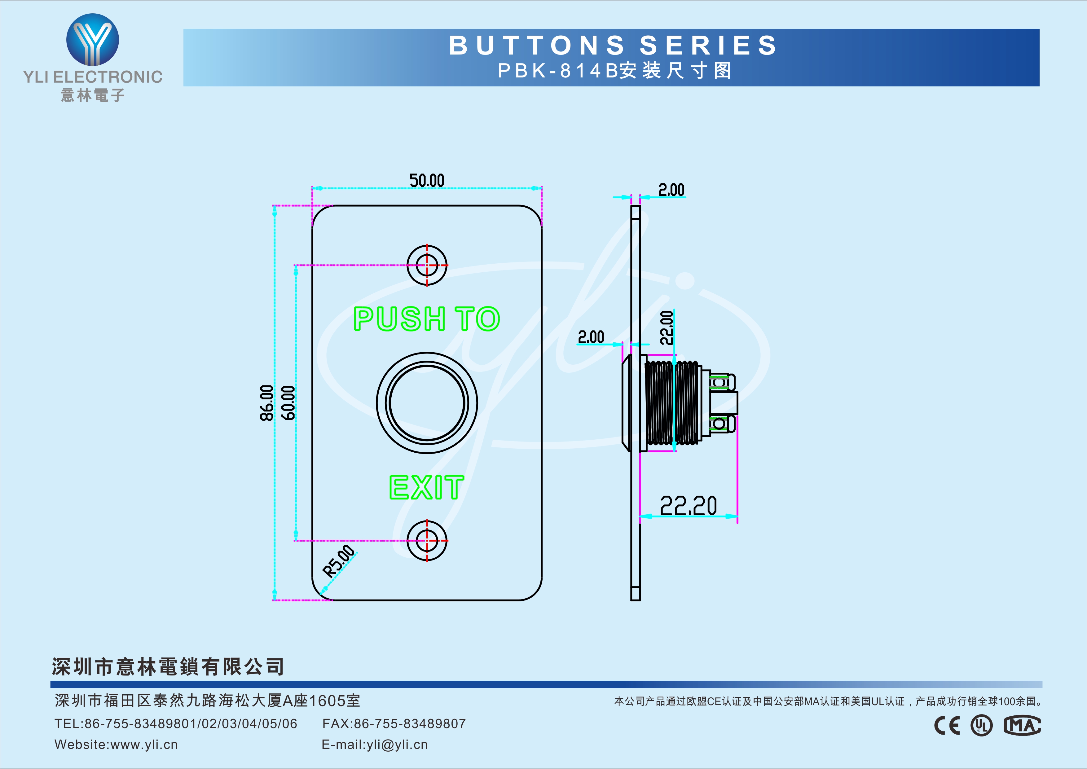 PBK-814B是一款耐用型按壓式不銹鋼門禁專用開關,面板選用304不銹鋼拉絲工藝,按鈕選用銅鍍鉻,經CNC車床加工后拋光而成,100萬次耐用測試合格,產品美觀、耐用,是門禁系統配套的最佳選擇。