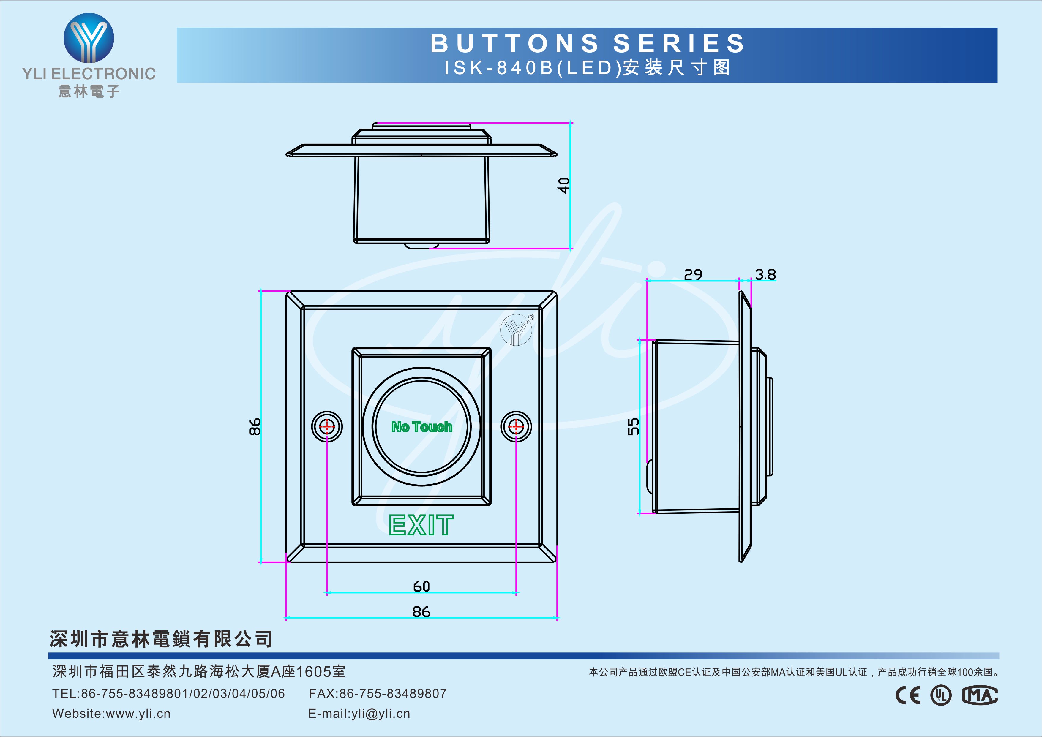 ISK-840B(LED) 是一款紅外感應(yīng)門禁開關(guān), 采用304不銹鋼拉絲處理,耐磨抗沖擊,堅固耐用。感應(yīng)距離0.1-10cm可調(diào)。LED燈顯示: 藍色為待機狀態(tài),紅色為開門狀態(tài)。適用于智能樓宇、住宅小區(qū)、辦公樓、酒店、醫(yī)院、體育館等場所使用。
