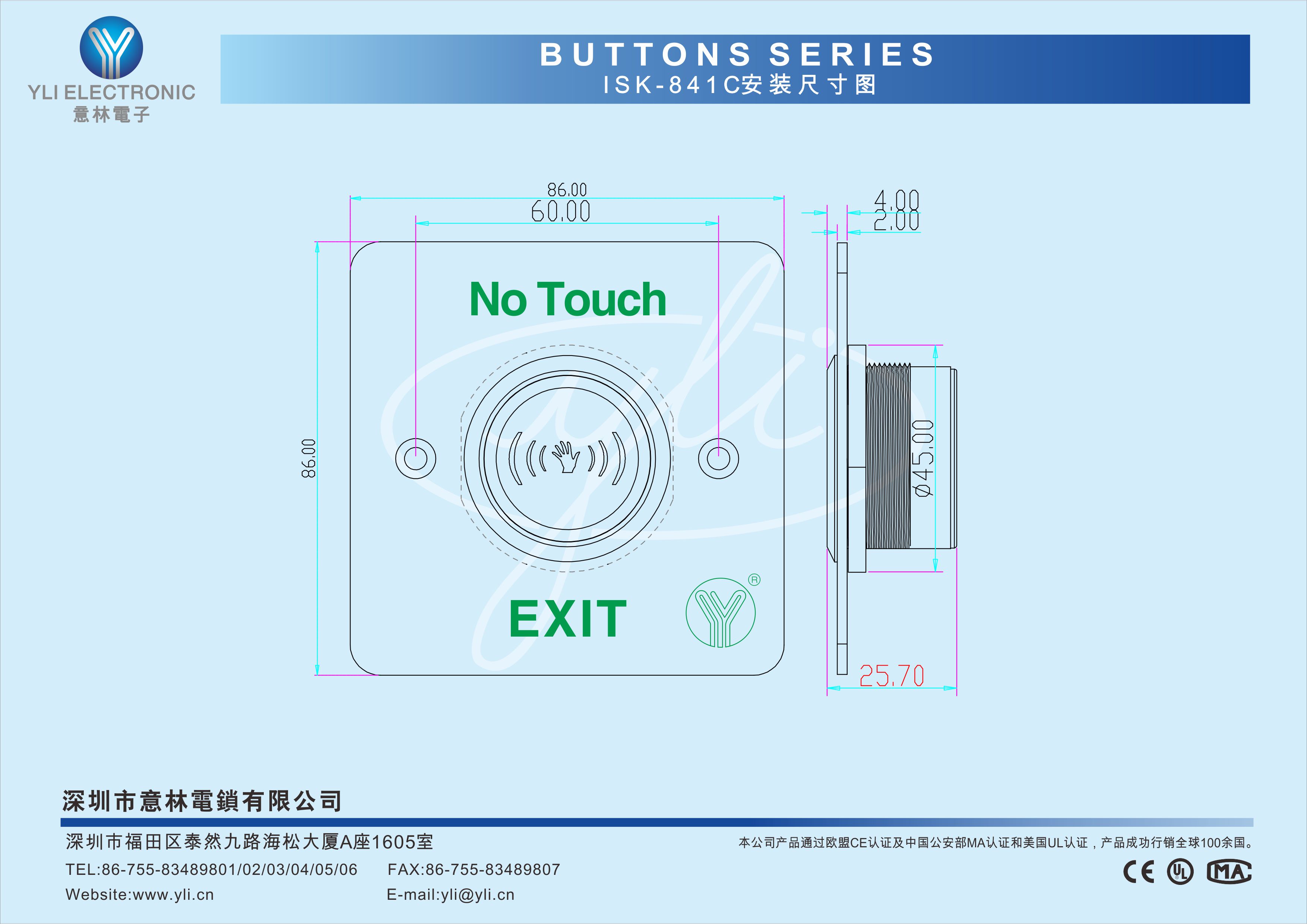 ISK-841C(LED) 是一款紅外感應門禁開關, 具有延時可調(diào)功能及紅外感應功能,感應距離4-12cm可調(diào)。LED燈顯示: 紅色待機狀態(tài); 綠色動作狀態(tài)。采用304不銹鋼拉絲工藝處理,耐磨抗沖擊,堅固耐用。適用于智能樓宇、住宅小區(qū)、辦公樓、酒店、醫(yī)院、體育館等場所使用。