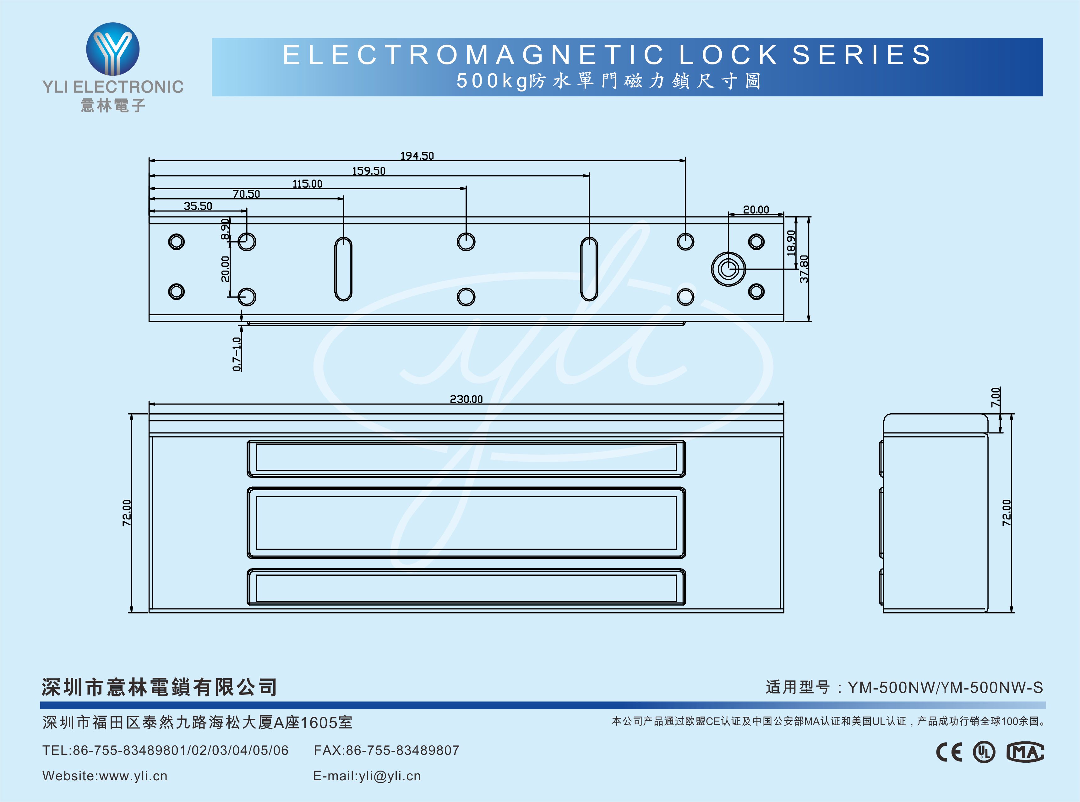 YM-500NM/YM-500NM-S防水型單門防水磁力鎖附信號輸出是針對木門、金屬門、玻璃門、防火門等設計的。設有一組鎖狀態信號(NO/COM)輸出接點,為門禁系統實時反饋信息。意林磁力鎖加大電磁吸力設計,吸力超強,鎖芯特殊加強焊接工藝,抗撞擊力及抗扭力比常規生產工藝強2-3倍,更堅固耐用。表面處理采用國際領先的電鍍工藝,通過國家實驗室240小時鹽霧測試,達到防氧化、防銹、防腐性能。適用于日常辦公場所或沿海鹽霧,潮濕(如:地鐵,機場,核電站,跨海大橋,港口碼頭,醫療機構,沿海城市建筑)等場景使用。本公司產品規格及配套齊全,內開式門或無框玻璃門、窄框門等均有安裝支架配套,有效滿足現代智能建筑的各種場景需求。
